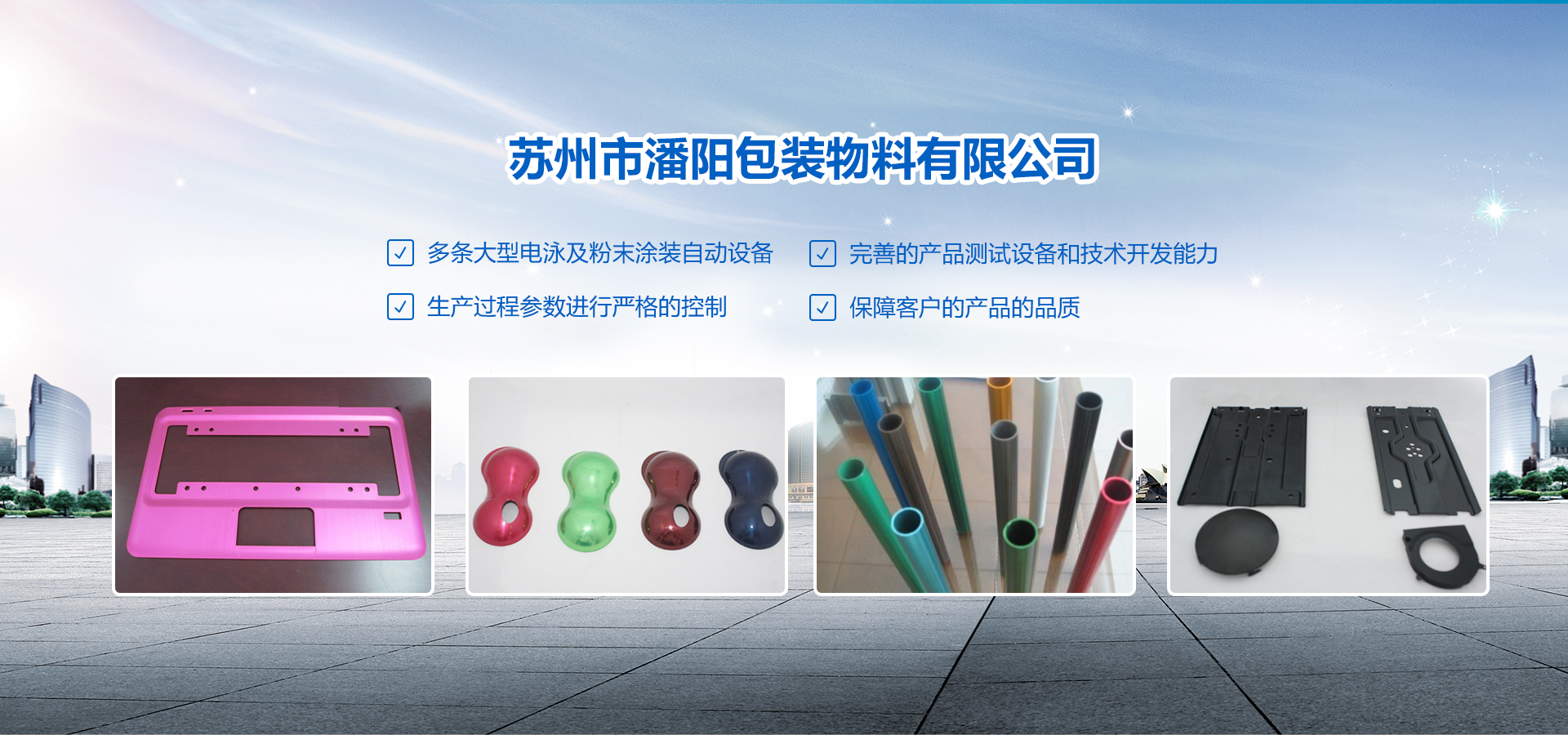 蘇州市潘陽包裝物料有限公司創(chuàng)建于2002年4月。坐落于美麗的蘇州相城。占地面積8000㎡,目前公司人員約150人,技術(shù)及管理人員約30余人。 專業(yè)從事彩色、黑色粉末涂裝及電泳等表面處理加工服務(wù)。公司現(xiàn)有多條大型電泳及粉末涂裝自動(dòng)設(shè)備,并有完善的產(chǎn)品測(cè)試設(shè)備和技術(shù)開發(fā)能力,對(duì)生產(chǎn)過程參數(shù)進(jìn)行嚴(yán)格的控制,從而保障了客戶的產(chǎn)品的品質(zhì)。公司已通過TS16949、ISO14000體系認(rèn)證,已經(jīng)與亞太和歐美地區(qū)的廣大客戶建立緊密的業(yè)務(wù)合作關(guān)系。